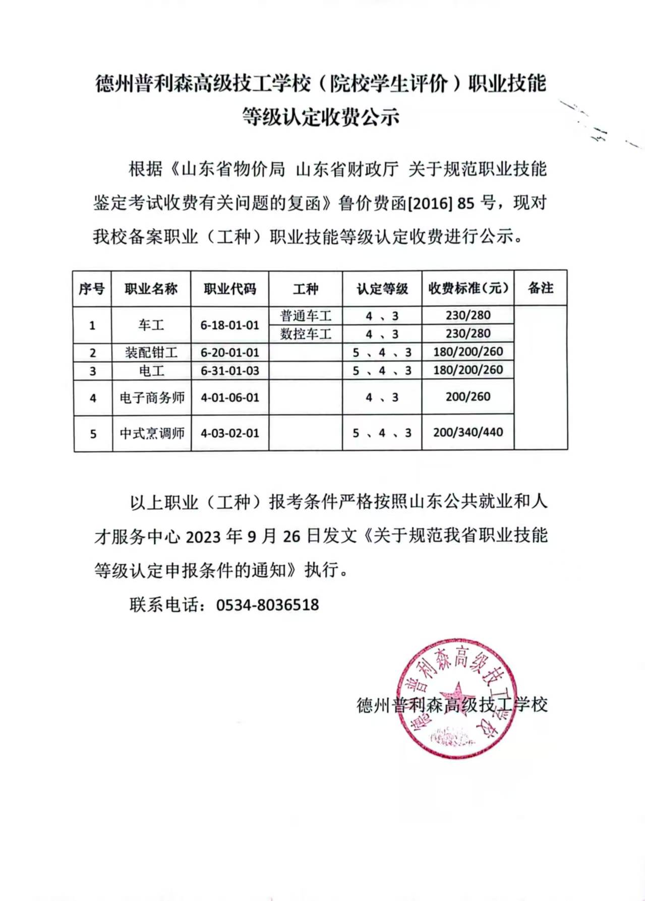 德州普利森高级技工学校(院校学生)职业技能等级认定收费公示